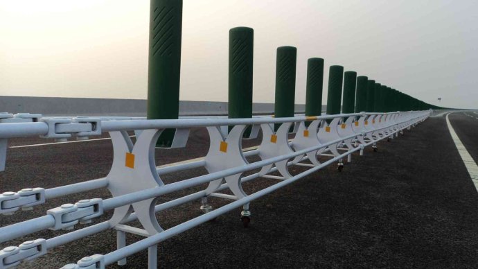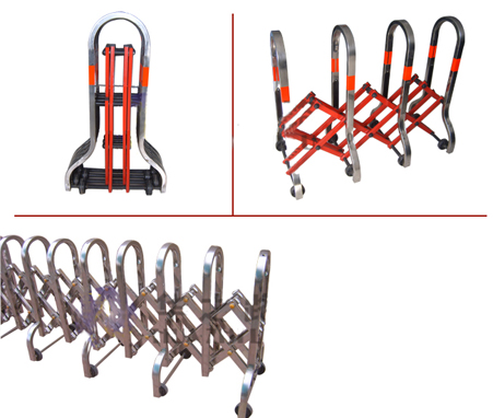 活动护栏 说明: 不锈钢伸缩护栏 材料组成: 镀锌管、喷塑 适用于高速公路中央隔离带、收费站 特点: 精致美观;灵活性好;档次高;底座可拆卸;带刹车、警示灯
